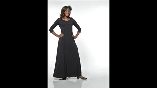 Heart shaped neck, 3/4 sleeve, floor length gown with inverted V-front empire waistband. Features back ties and no back zipper. Made in wrinkle resistant, easy care matte jersey stretch knit.